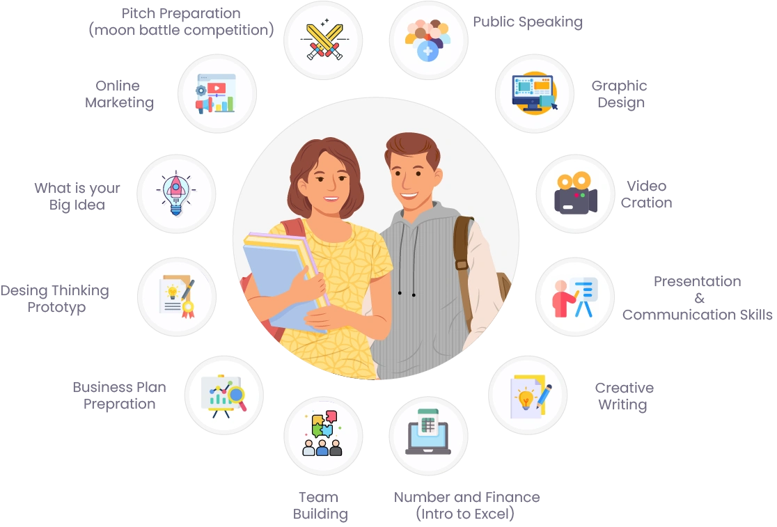 Power Skills Program has been designed by experts at Moonpreneur to help students in imbibing skills that will assist in their growth by instilling a sense of confidence and leadership qualities which will become a potent formula for future success.